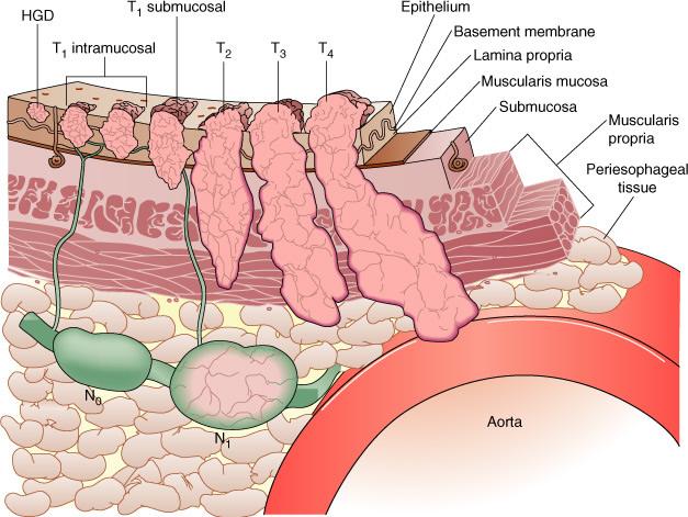 Na medida em que o tumor invade o órgão, aumenta o risco de invasão dos ductos linfáticos (em verde) e de causar metástase para os linfonodos (N0, N1, em verde). (associado à figura abaixo)