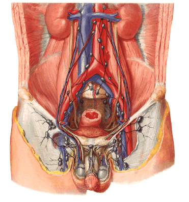 Linfonodos pélvicos retroperitoneais, canalículos linfáticos e linfonodos representados em preto. (associado à figura abaixo)