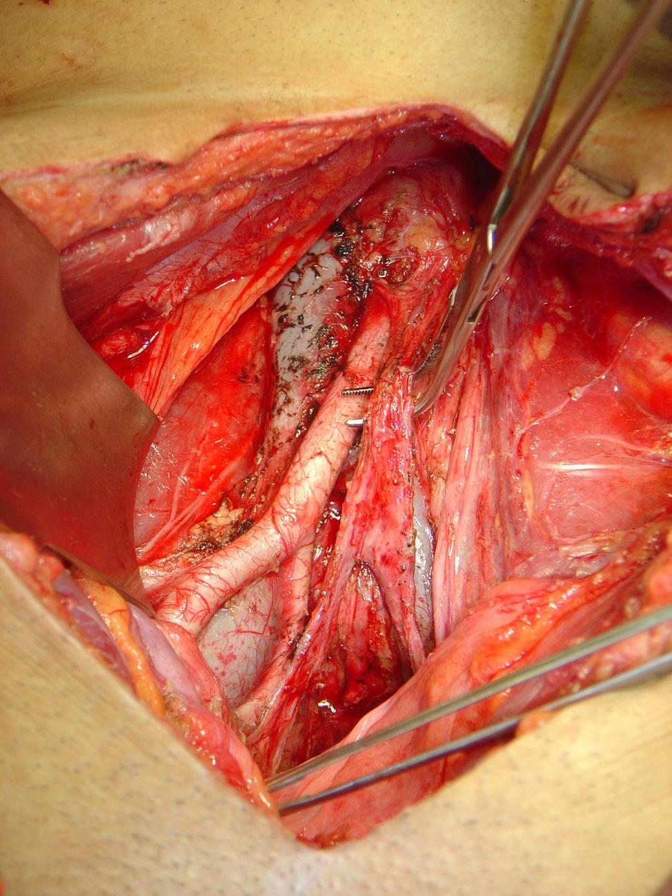 Aspecto da pelve, do mesmo paciente, após retirada dor linfonodos do retroperitônio e da pelve, com preservação de nervos pélvicos. (associado à fotografia abaixo)